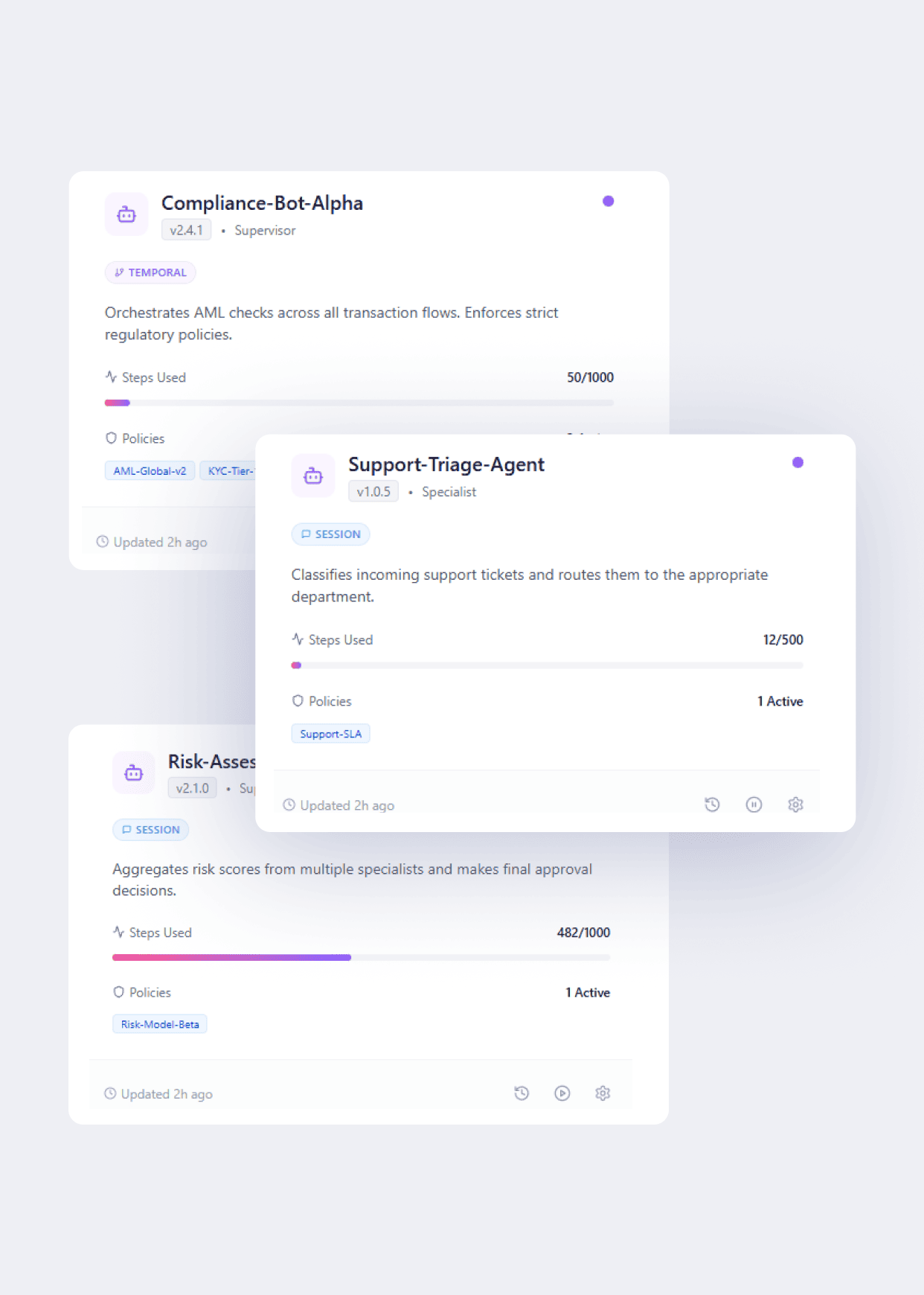 - Agent Lifecycle Modeling: Define versioning, typed I/O, rollback, and error/compensation flows with human-in-the-loop approval.